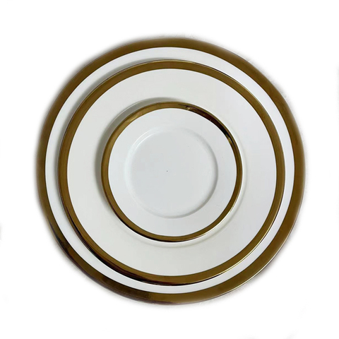 Дешевая ресторанная тарелка, наклейка, ободок, плоские тарелки, Набор круглой посуды, белая и золотая керамическая тарелка для свадебного стола, аренда