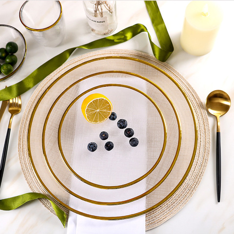 2025 Северная Гальваническая ткань, текстурированная круглая тарелка, золотой серебряный ободок, стеклянная посуда, столовая посуда, Западный стейк, салат, стеклянная посуда