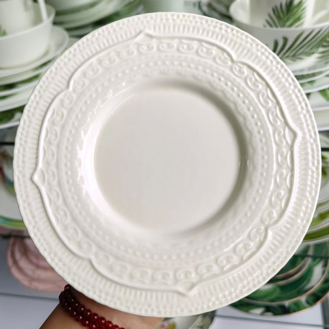 Fransız ortaçağ tarzı kabartma dantel seramik plakalar eski ince yemek tabakları çiçek taraklı kenar tatlı salata yemeği çanak çömlek